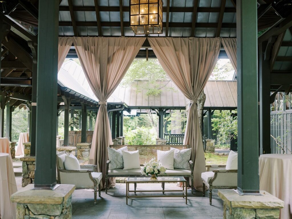 After the ceremony, guests moved into cocktail hour across the covered porches and open-air spaces overlooking the grounds. Lounge seating and soft draping created places to gather, while florals carried through each area.