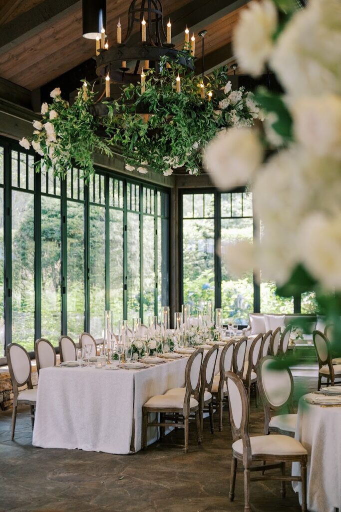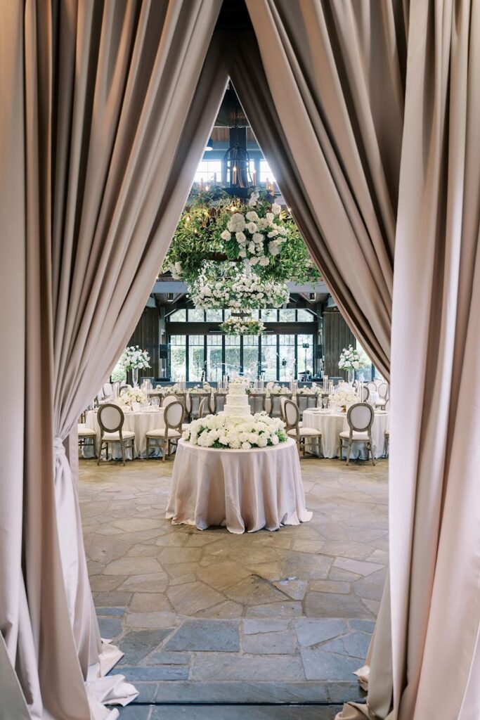 Dinner took place inside a space defined by draping and candlelight. Curtains framed the entrance and marked the transition into the room. Overhead greenery and white blooms softened the wood beams and drew the eye upward.