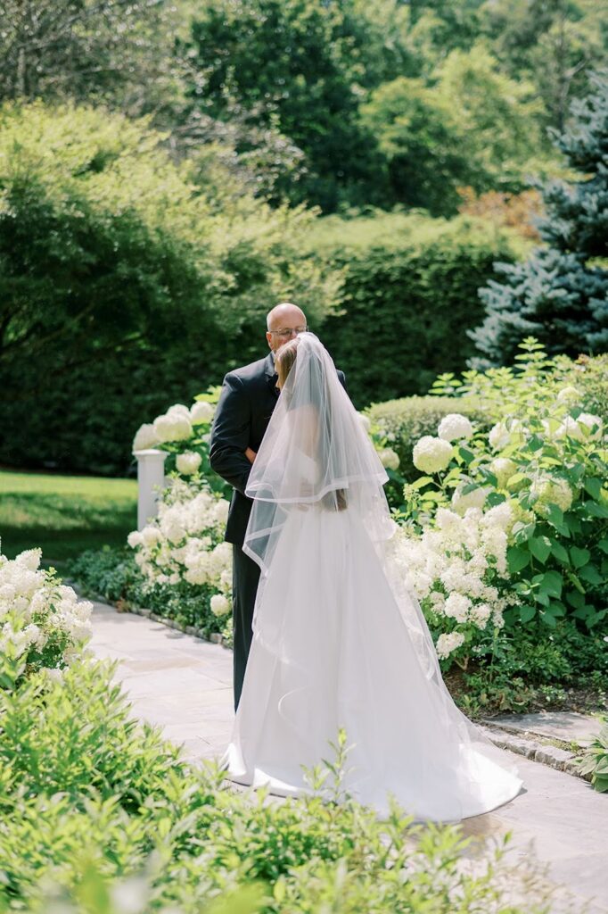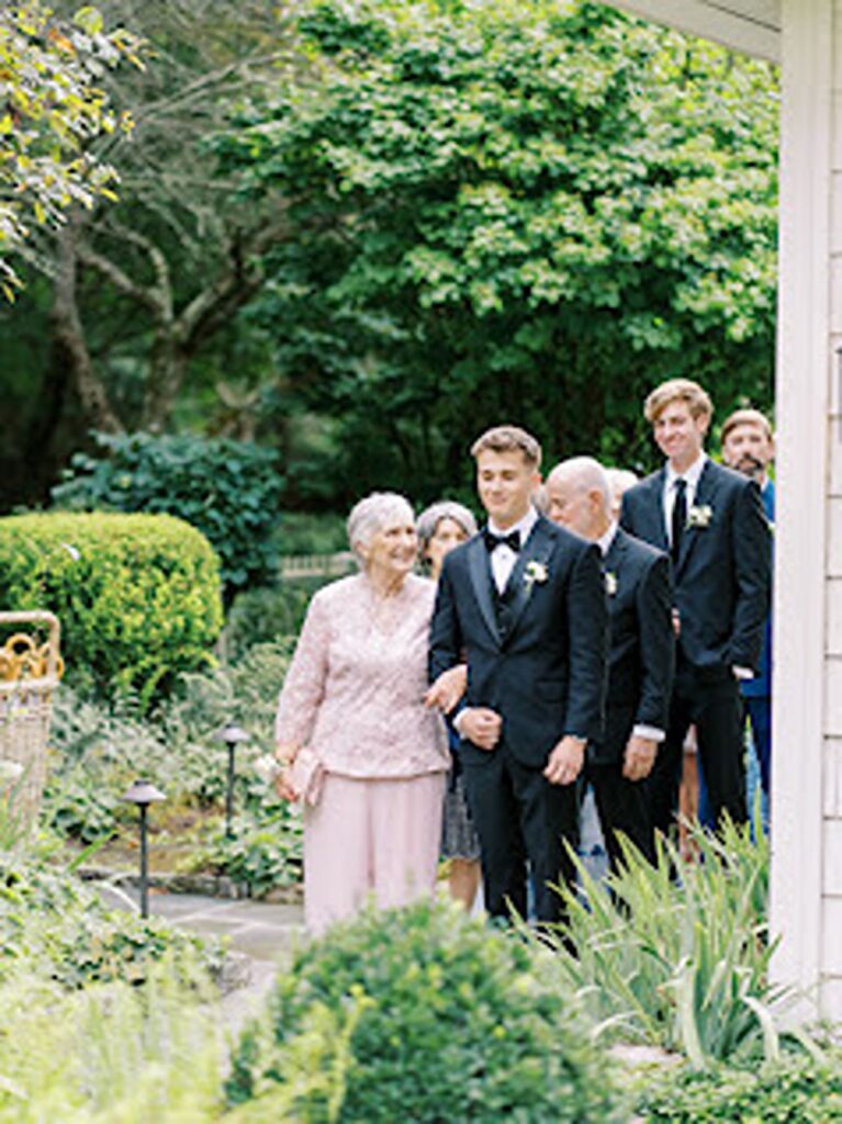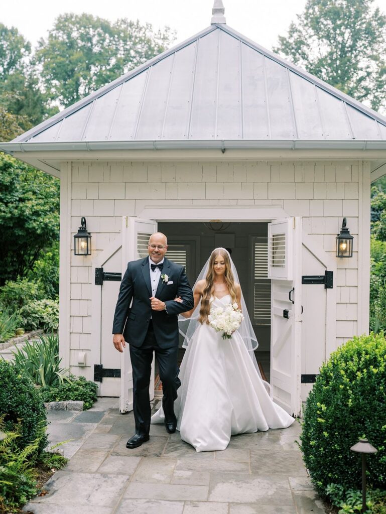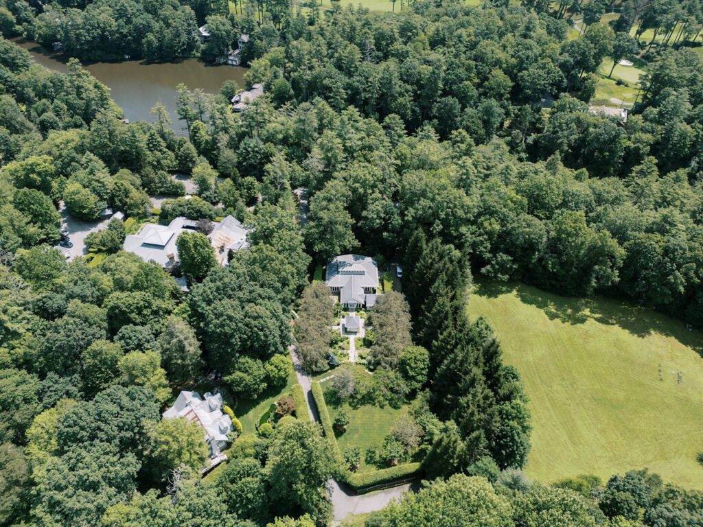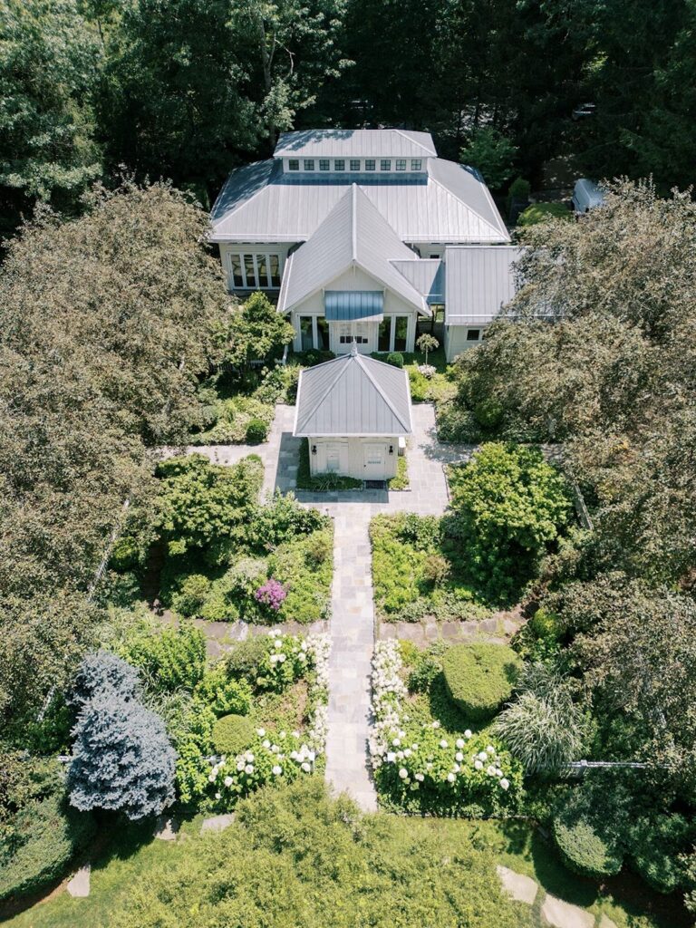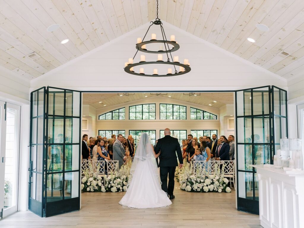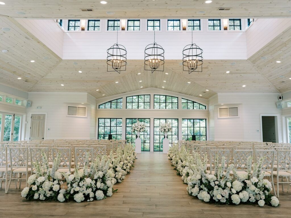 The ceremony made full use of the property’s natural depth. White blooms and fresh greenery lined the aisle, creating a garden-like path that connected to the trees just outside. The florals felt layered but not heavy, allowing the setting to remain present.