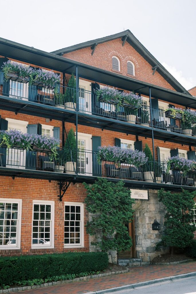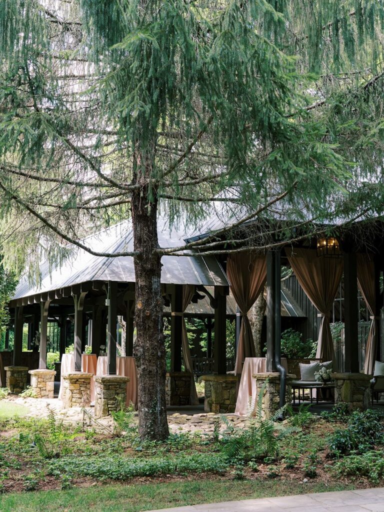 Caroline and Ryan hosted their wedding at The Farm at Old Edwards in Highlands, North Carolina. In July, the property feels full and settled into the season, with the landscape at its peak. Garden paths wind through dense greenery, water features reflect the surrounding trees, and each part of the grounds feels tucked into the landscape in a natural way.