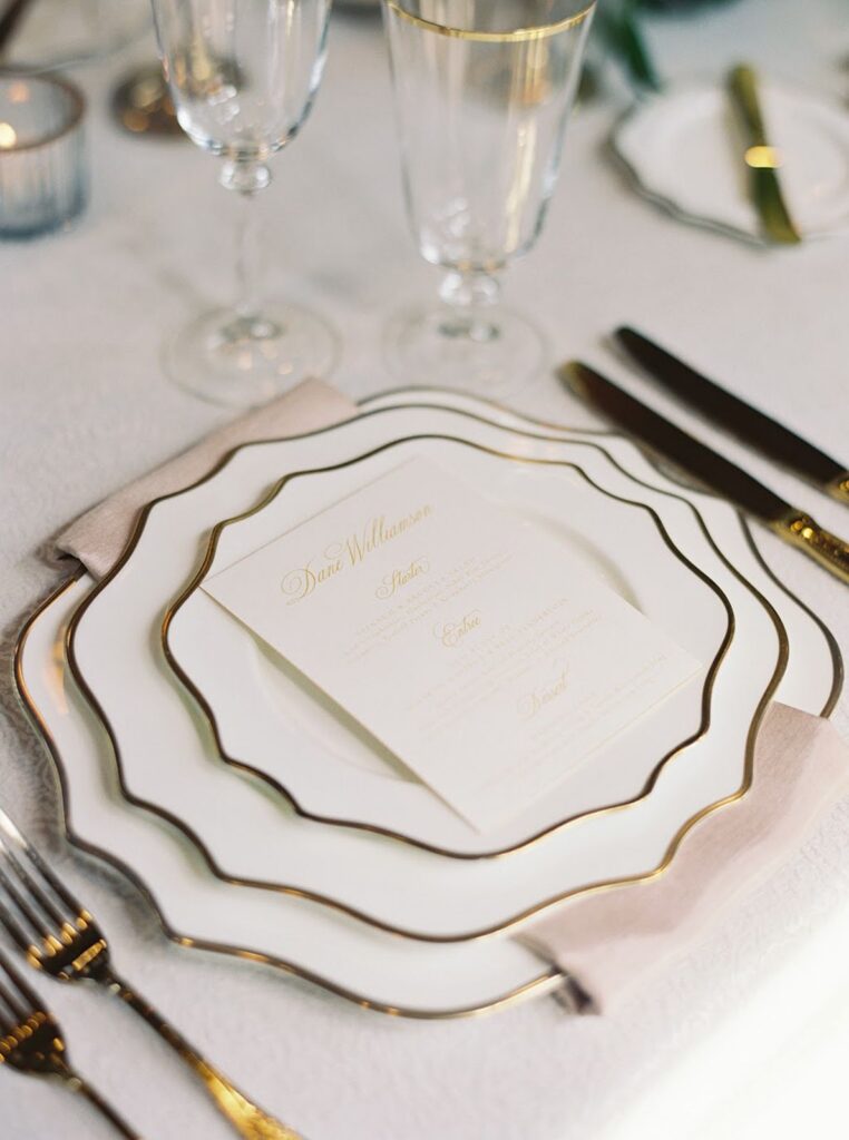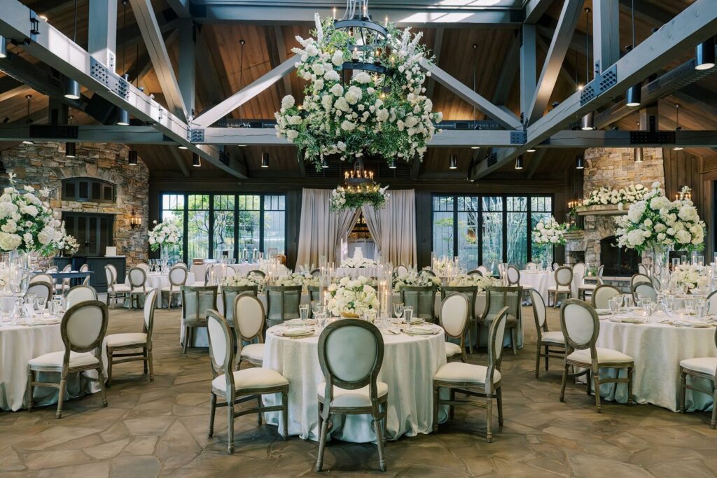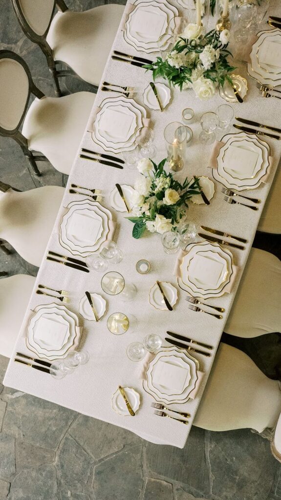 Tables featured textured linens, scalloped china with gold trim, and glassware. Low arrangements of white flowers and greenery sat at the center of each table. Round and long tables filled the room, while warm gold accents added depth against the wood and stone.